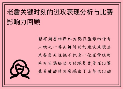 老詹比赛战术解析:如何利用个人优势带动团队攻防体系的完美融合